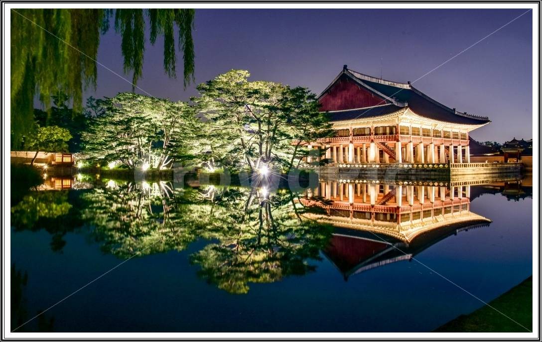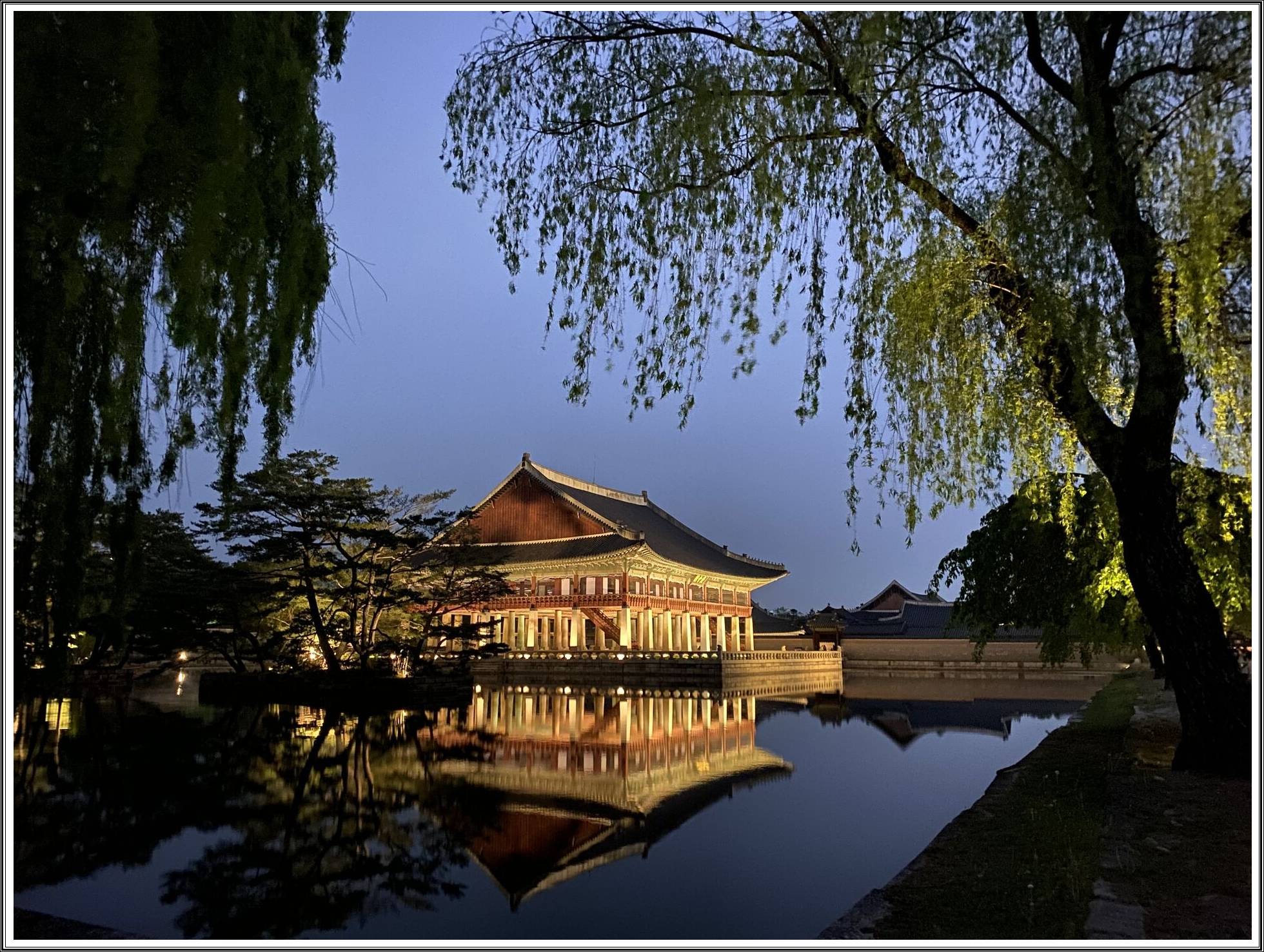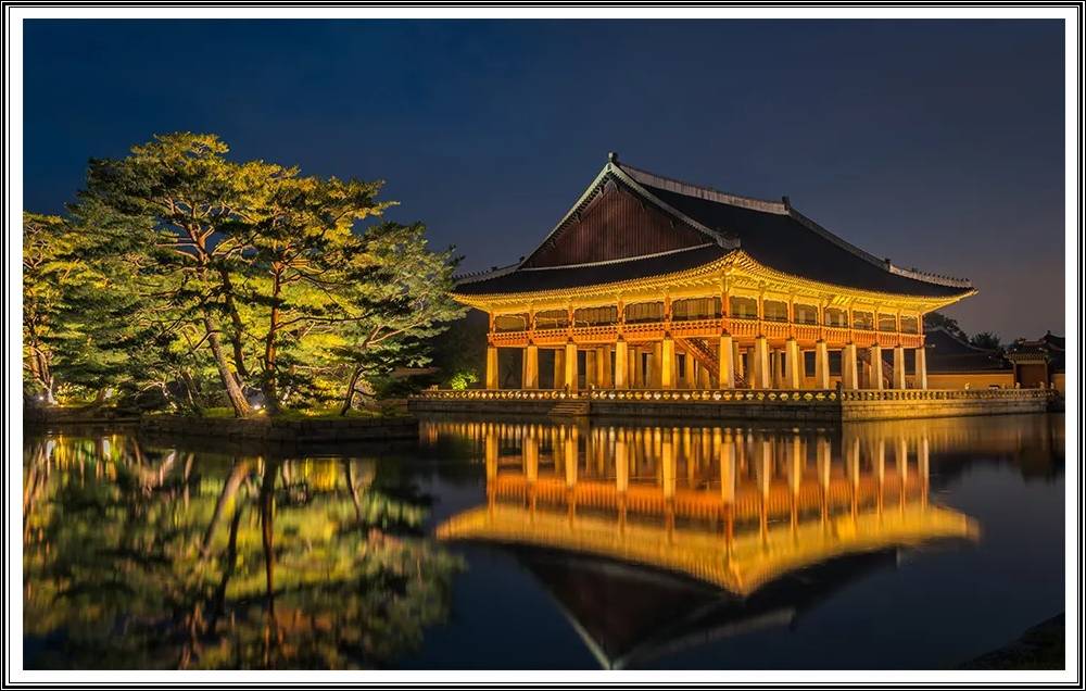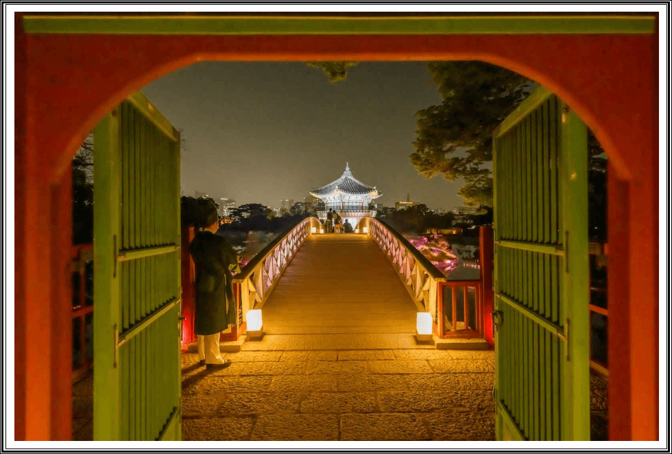 근정전 앞 연못(조명 반사), 경회루(수면 야경), 향원정(정자 풍경). 삼각대는 제한될 수 있으니 손떨림 방지 모드 활용하세요. - 복장: