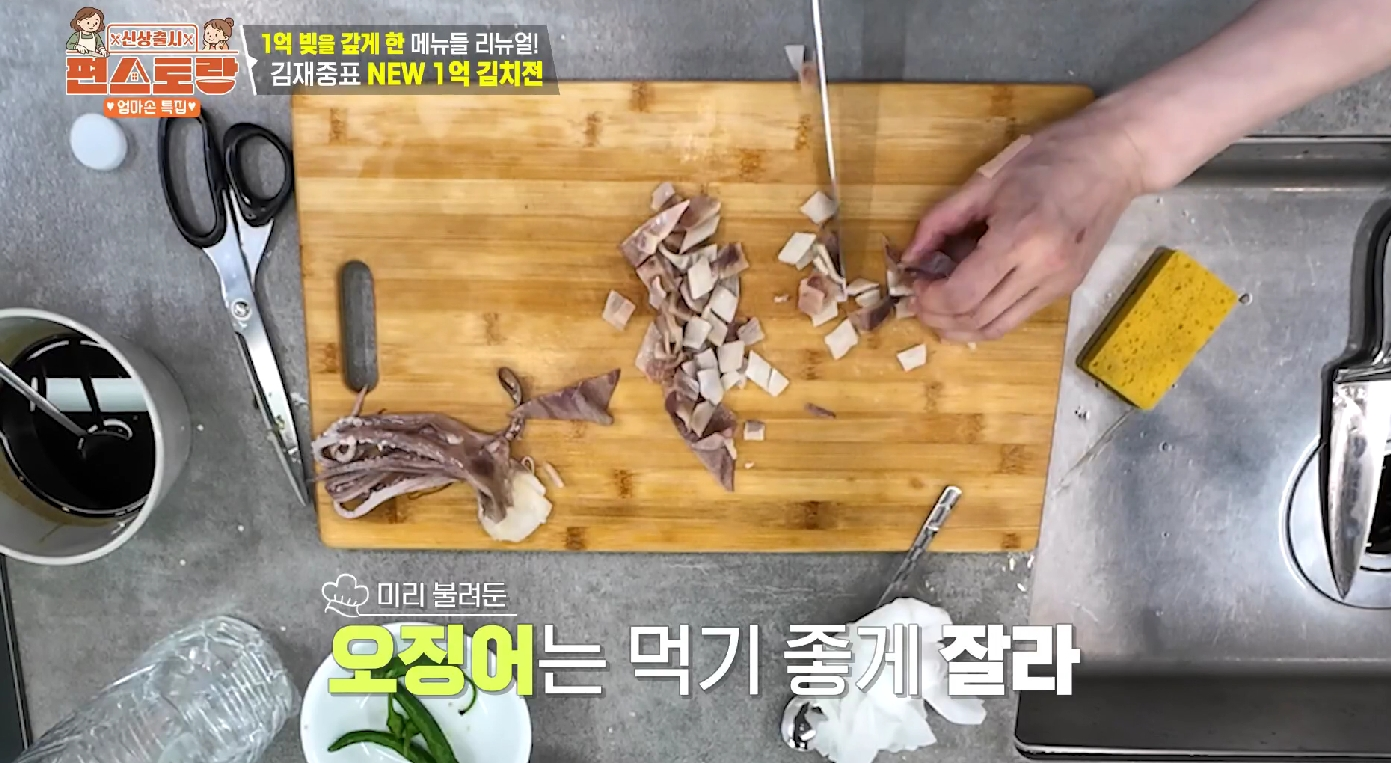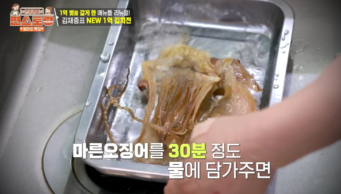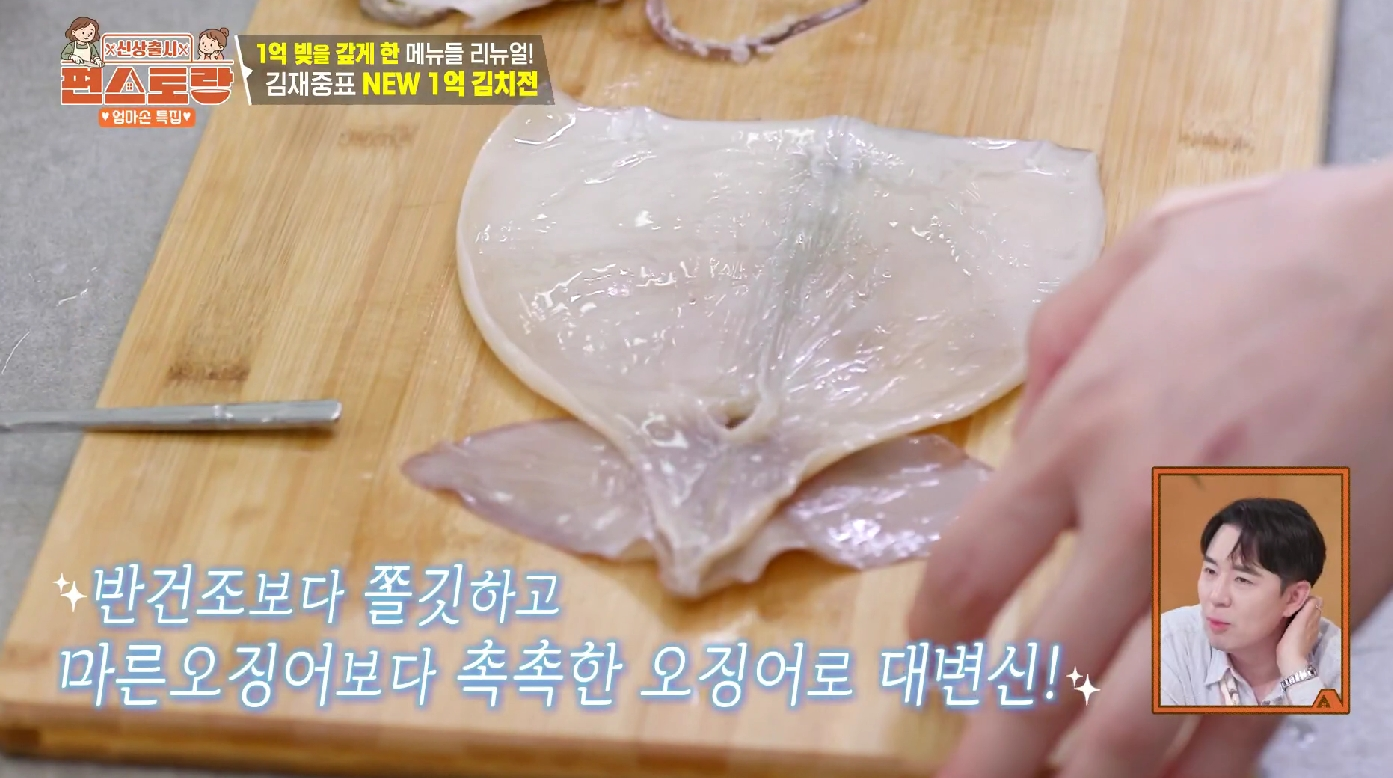 그러다 김재중 셰프의 기발한 레시피를 발견했습니다. 바로 마른오징어를 불려 넣는 방법입니다! 보관이 용이한 마른 식재료를 활용해 즉석에서 깊은 감칠맛을 끌어낸다는 아이디어가 정말 천재적이었죠.