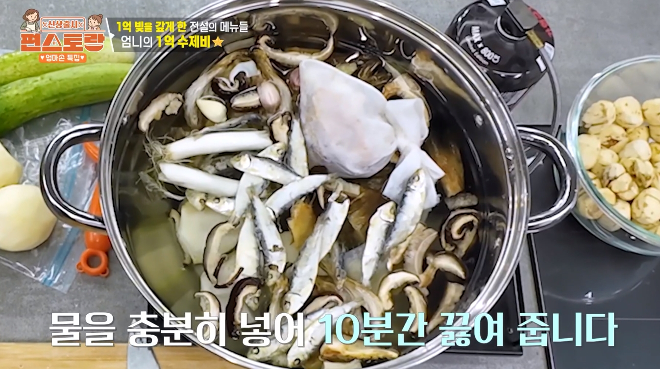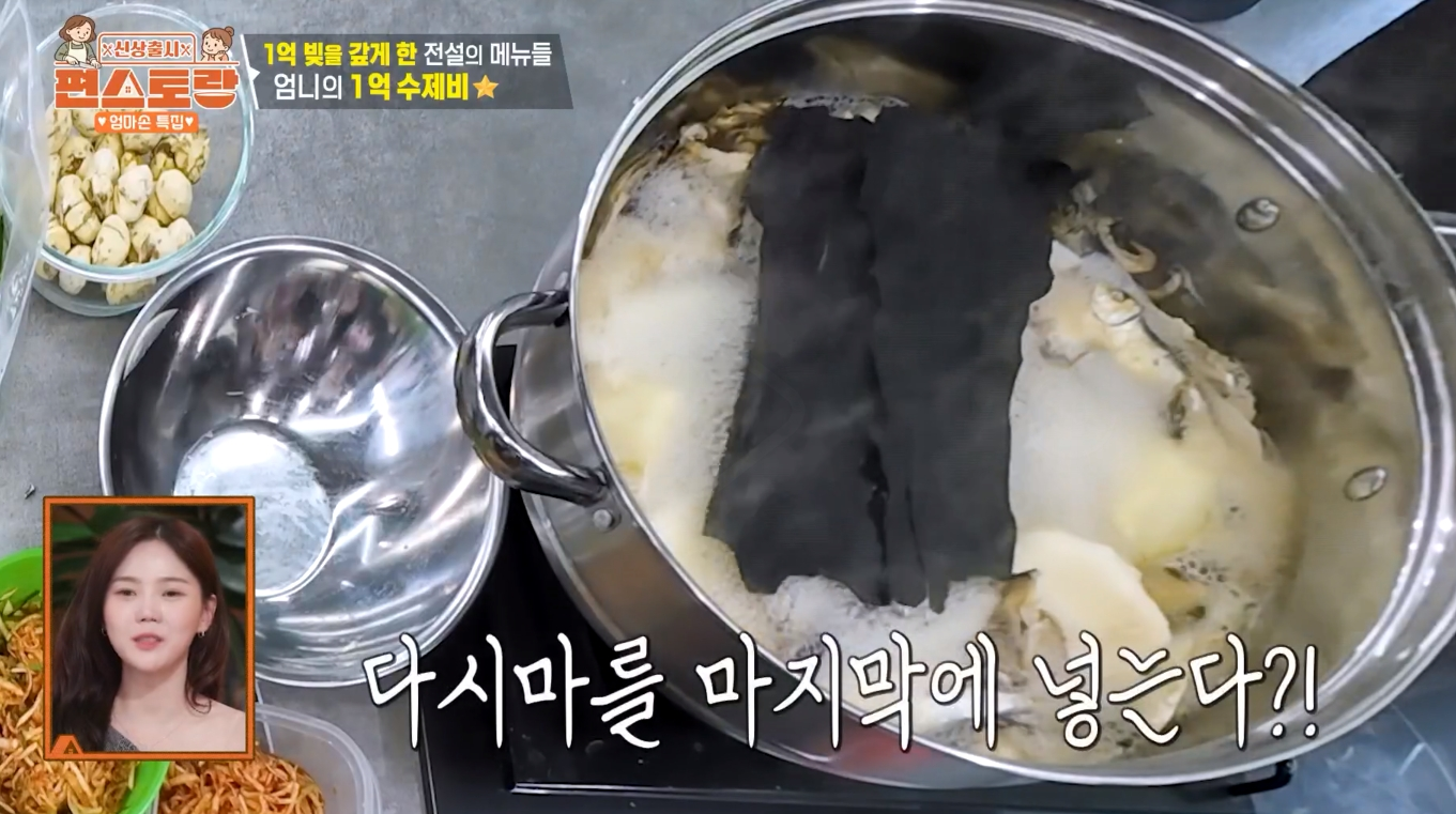 - 10분이 지나면 다시마 1장을 넣고 5~6분만 더 끓인 후, 모든 건더기를 건져내어 깨끗한 육수 베이스를 완성합니다.