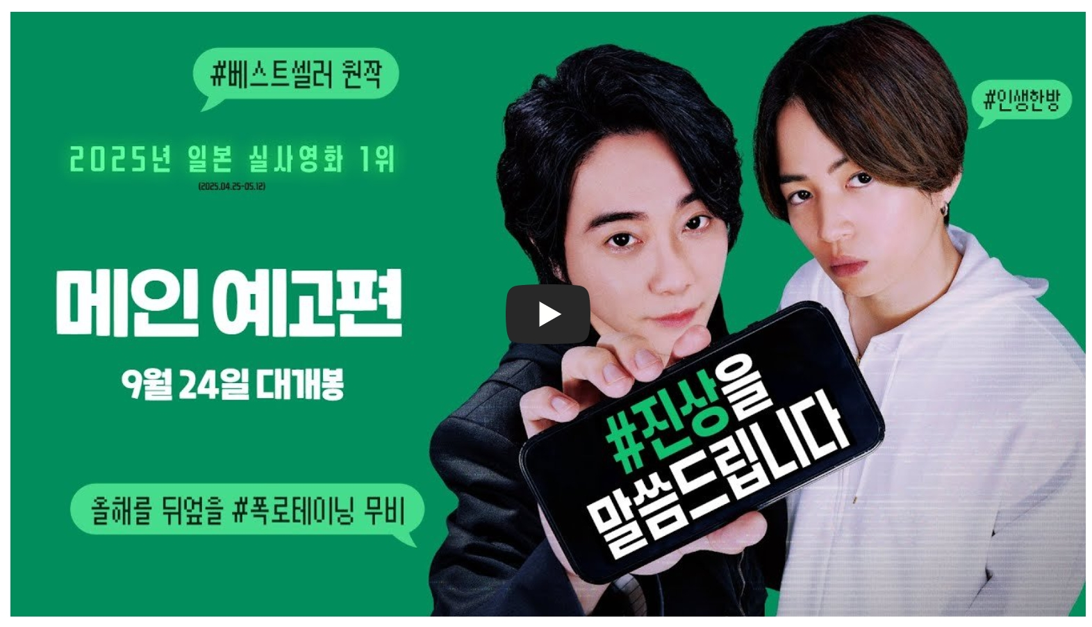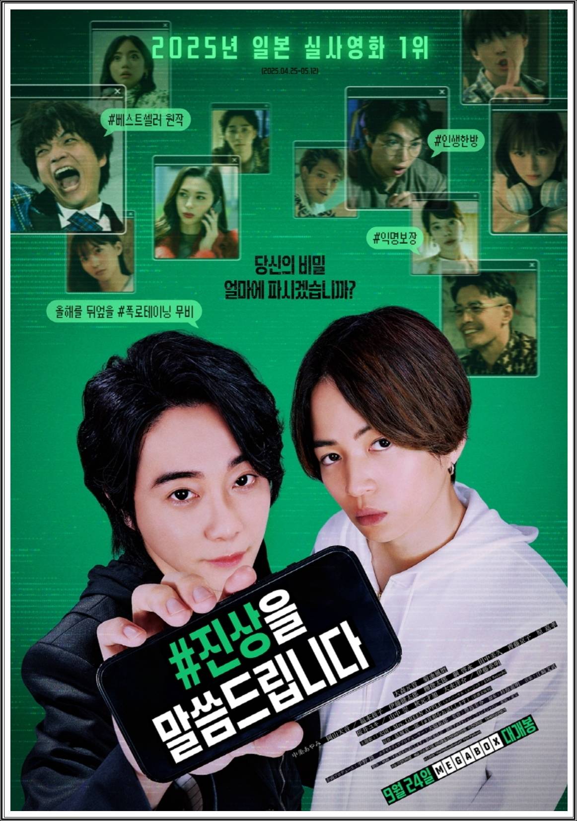 진상을 말씀드립니다는 일본 미스터리 영화로, 익명의 스피커가 스캔들과 사건의 진실을 폭로하며 후원금을 받는 라이브 방송을 배경으로 한 심리 스릴러입니다.