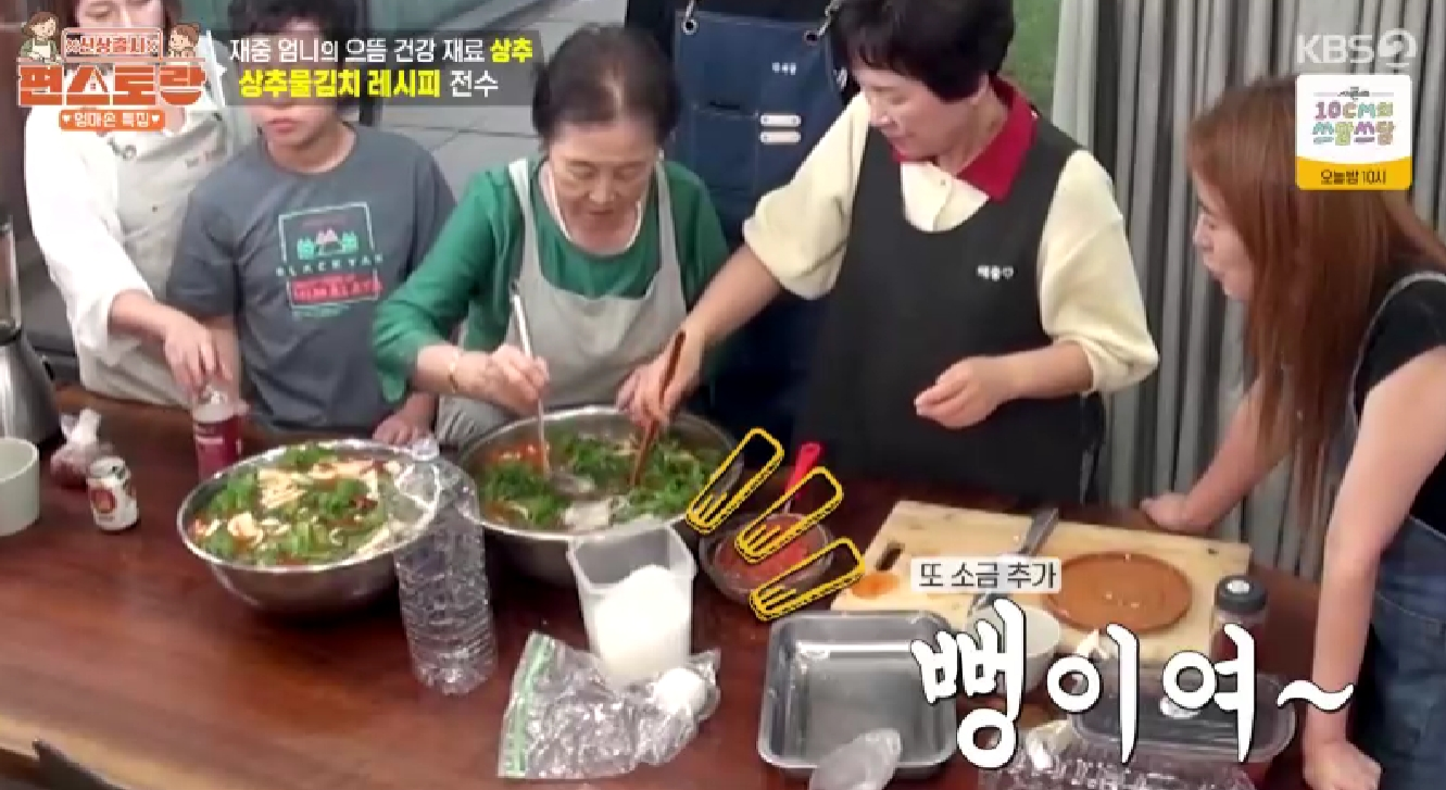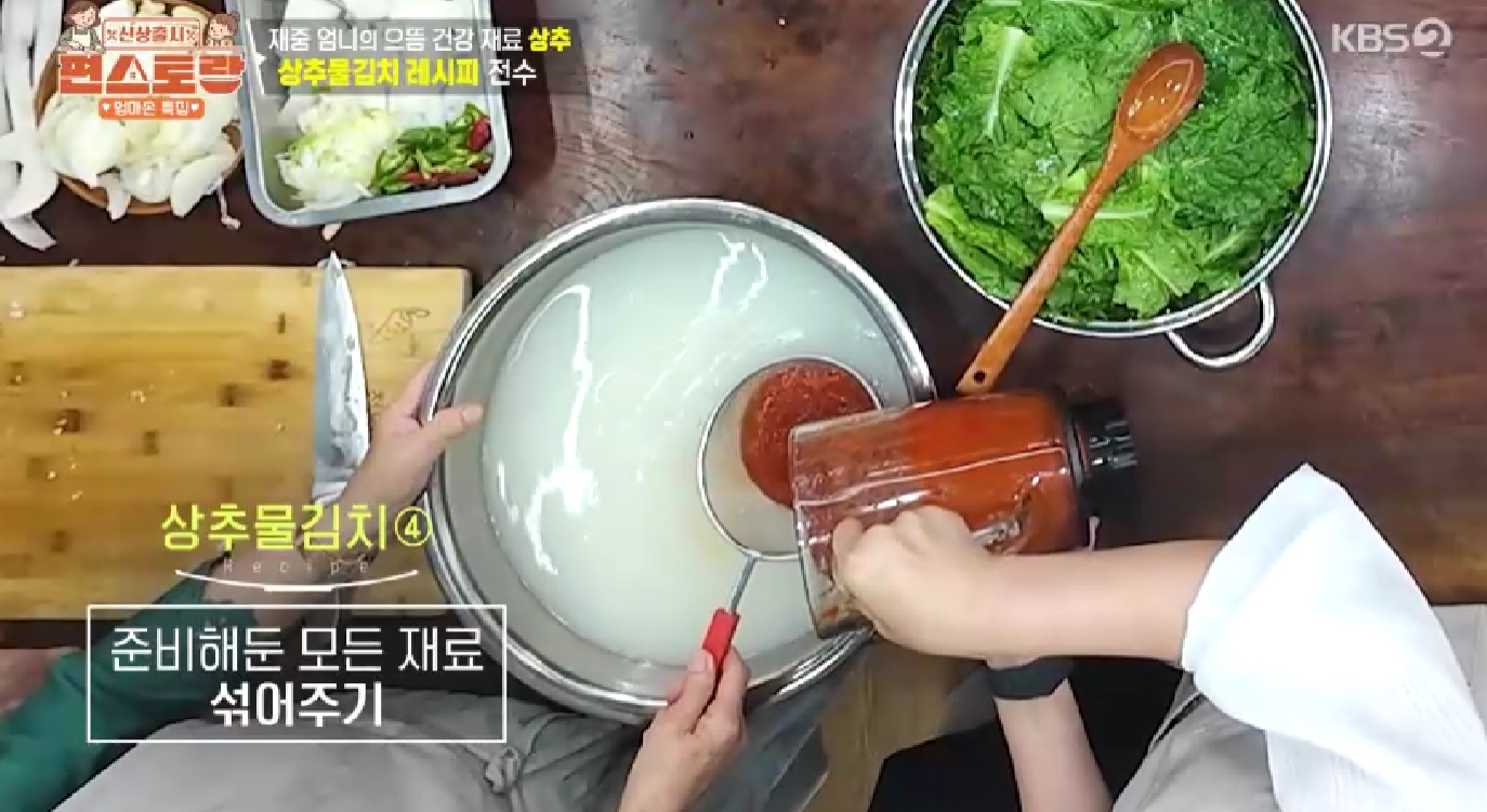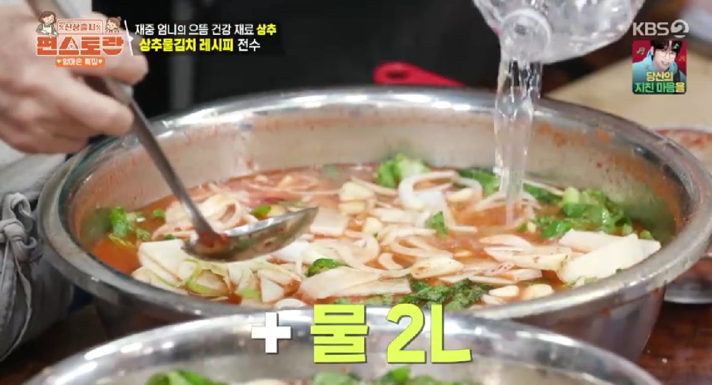 - 물을 추가로 넣고, 마지막 간은 천일염을 넣어 취향에 맞게 맞춰주면 김재중 상추물김치 레시피가 완성됩니다. 천일염은 짠맛 외에 미네랄의 감칠맛을 더합니다.