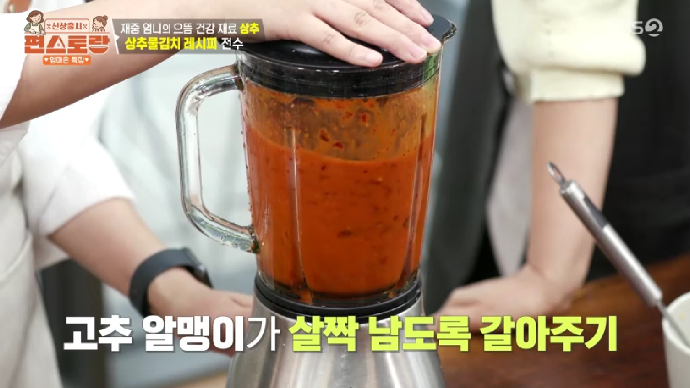 물김치하면 보통 무나 오이를 생각하지만, 상추를 주재료로 쓴다는 점이 독특했습니다. 특히 건고추를 갈아 체에 거르는 방식이나, 밀가루풀을 넣어 국물의 농도와 감칠맛을 잡는 디테일이 인상 깊었습니다