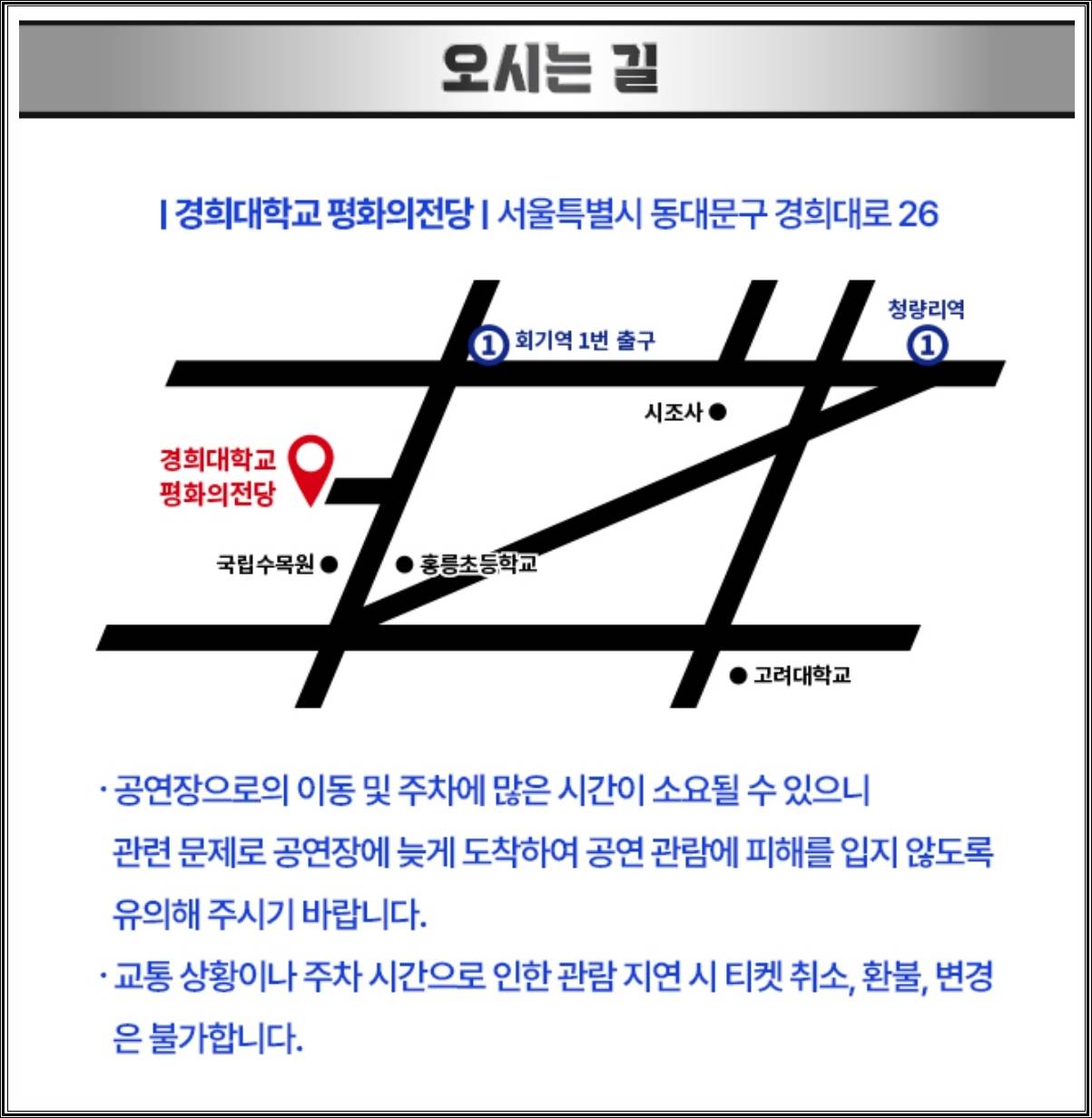 장소는 서울 동대문구 경희대학교 평화의 전당이에요. 접근성이 좋아 대중교통 추천드려요. 아래는 상세 경로예요.