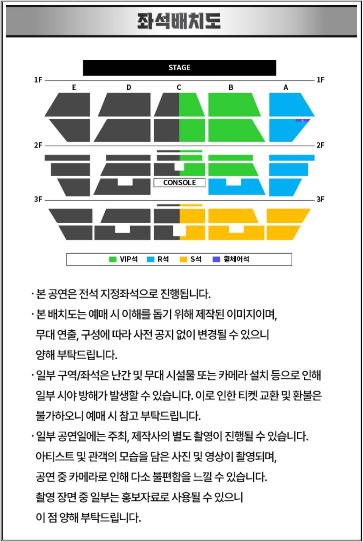 | 자리 이동 | 공연 중 불가, 종료 후 퇴장 |