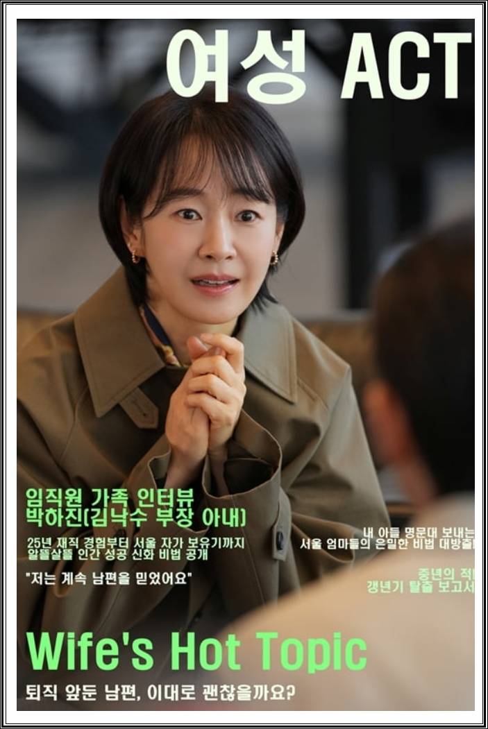 극은 김 부장의 직장 일상과 가정의 균열을 적나라하게 그려냅니다. 아내 박하진(명세빈)이 생계 전선에 뛰어들고, 아들 김수겸(차강윤)이 아버지의 고정관념에 반항하며 세대 갈등이 더해지죠.