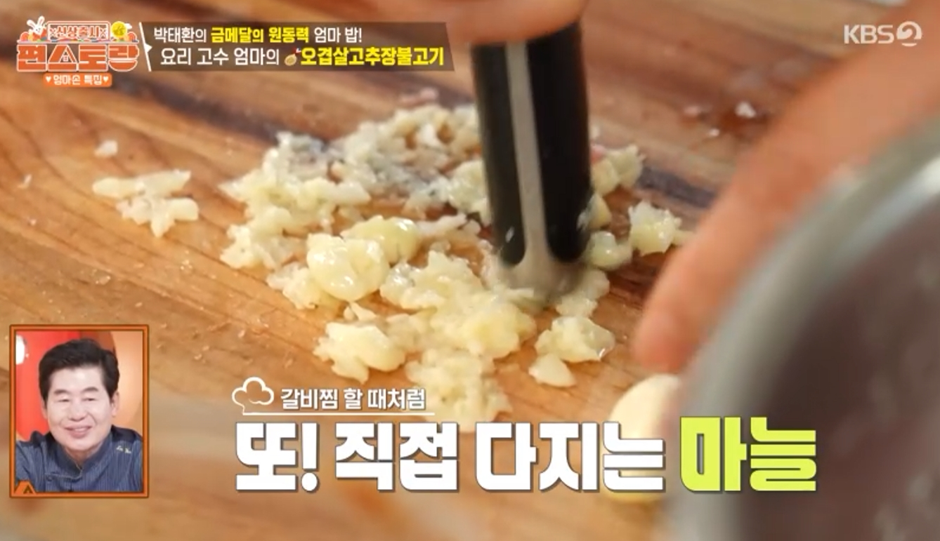 - 굵게 다진 마늘은 양념을 볶을 때 타지 않고 신선한 마늘 향을 오랫동안 유지시켜주는 중요한 비결입니다.