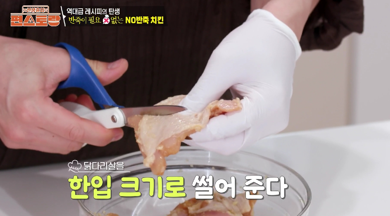 - 씻은 닭고기는 먹기 좋은 한 입 크기로 자릅니다.