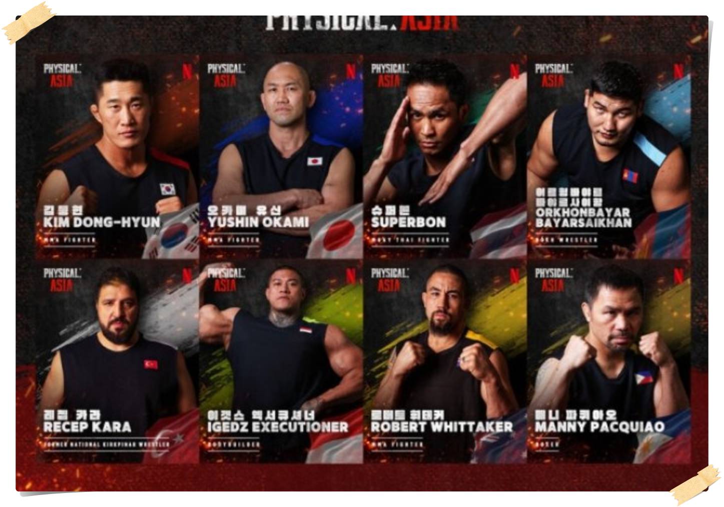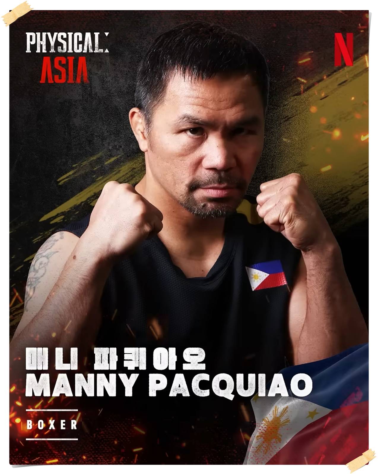 피지컬 아시아 필리핀 참가자는 매니 파퀴아오의 전설적 경험, 저스틴 코베니의 충돌력, 레이 퀘루빈의 괴력으로 완벽한 조화를 이룹니다. 제작발표회에서 파퀴아오는 “조합적으로 완벽하다”고 자신했어요.