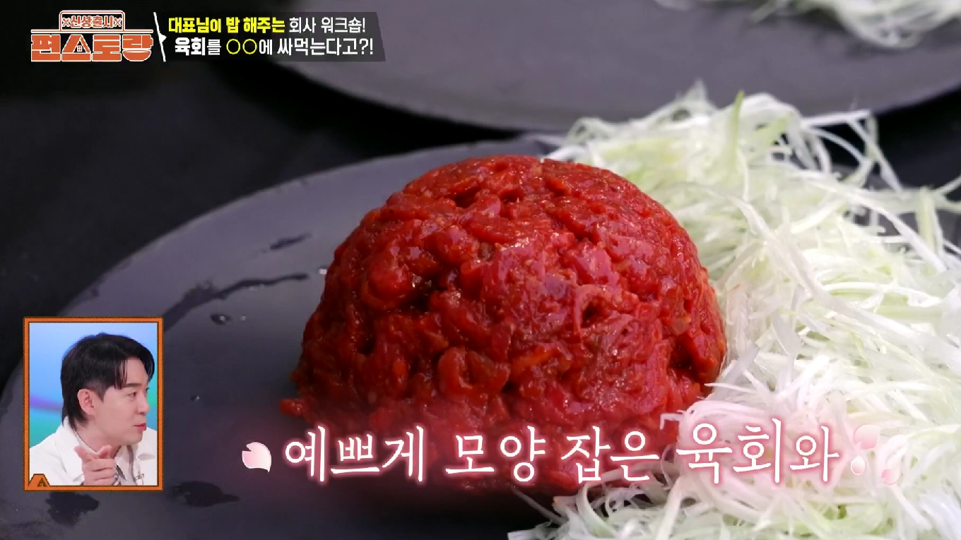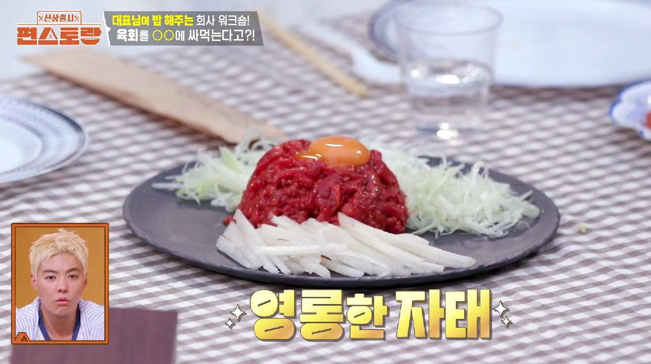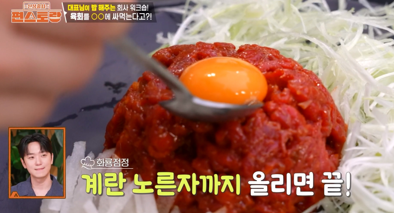 - 육회 위에 계란 노른자를 조심스럽게 올려 마무리하면 김재중 차돌육회쌈 레시피 완성!