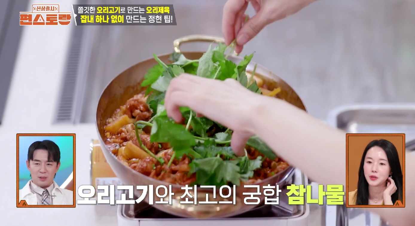 - 고기가 충분히 익으면 불을 끄고, 참나물 두 줌을 듬뿍 올려 남은 여열로 숨만 살짝 죽여주면 이정현 오리제육 레시피 완성입니다!