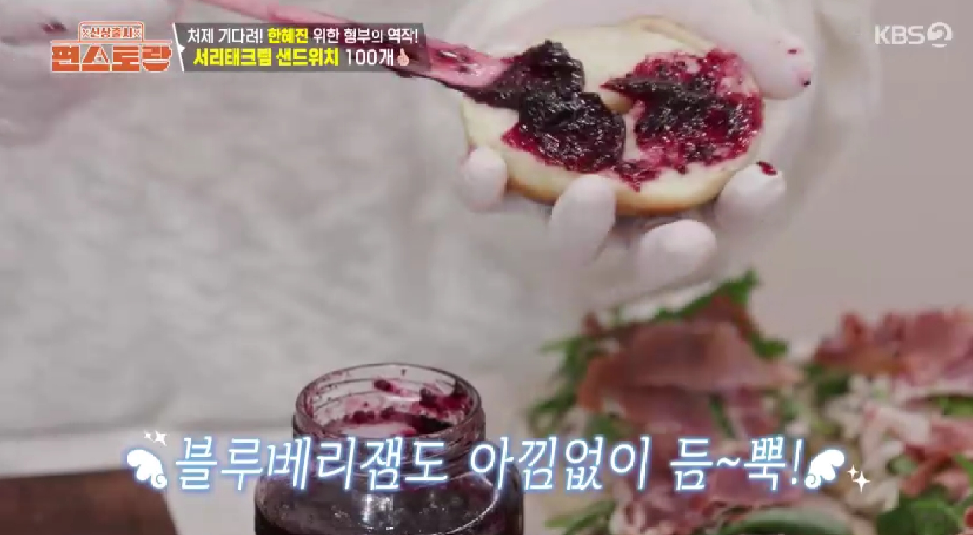 - 윗면 베이글에 블루베리잼을 바르고, 샌드위치를 덮어주면 형부샌드위치, 김강우 서리태크림치즈 샌드위치 레시피가 완성됩니다.