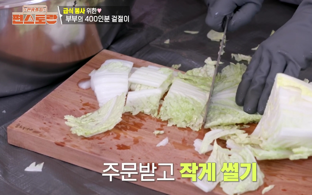 - 배추의 겉잎을 정리하고 밑동을 자른 뒤, 큼직한 잎은 반으로 갈라 한입 크기로 썰어줍니다.