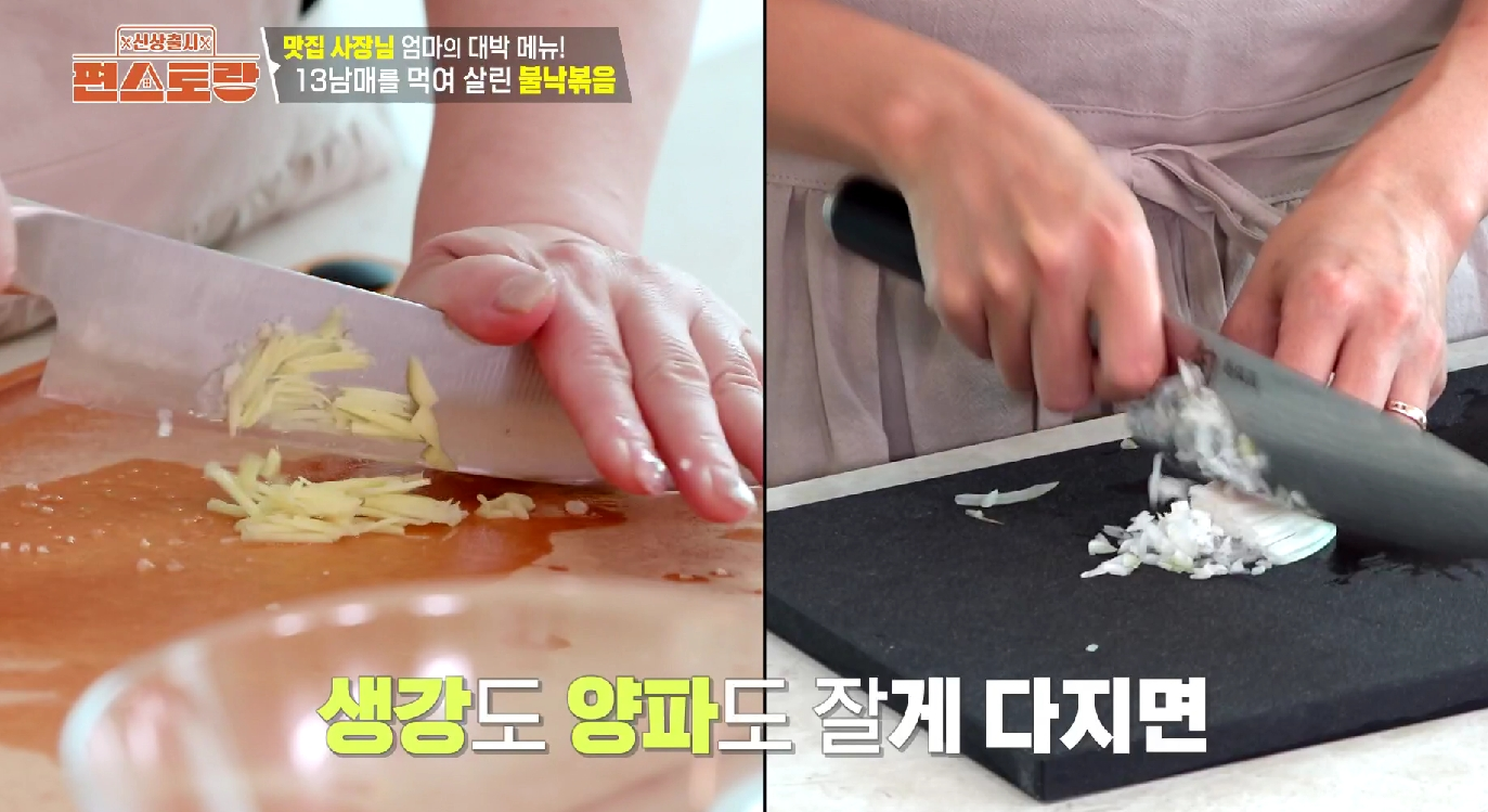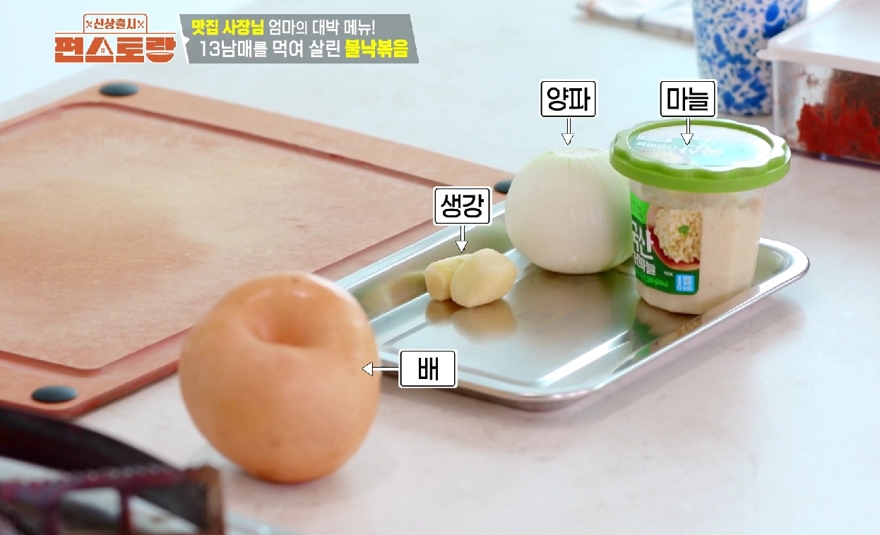 멸치 다시마 육수 대신 명태 대가리와 고추씨로 만든 남보라 우물 육수 레시피를 사용하면 확실히 시원하고 깨끗한 감칠맛이 더해져 맛의 깊이가 달라집니다. - 배와 생강: