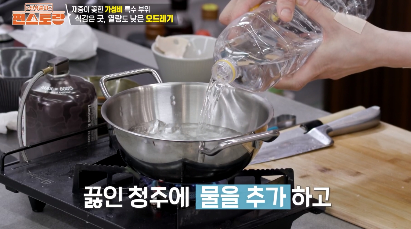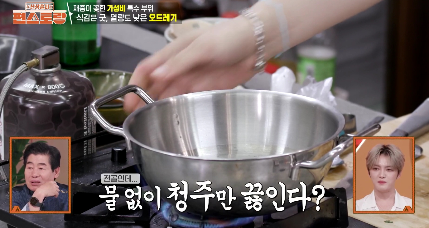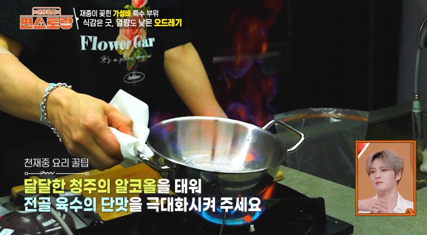 - 청주가 끓기 시작하면 냄비를 살짝 기울여 불을 붙여 알코올을 날려줍니다. 김재중 님의 팁! 증기가 더 이상 나지 않으면 알코올이 모두 날아간 것입니다.