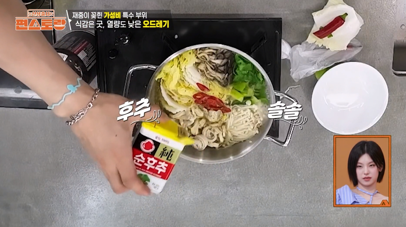 - 마지막으로 홍고추와 편 썬 마늘을 올리고 후추를 톡톡 뿌려 마무리하면 김재중 오드레기전골 완성!
