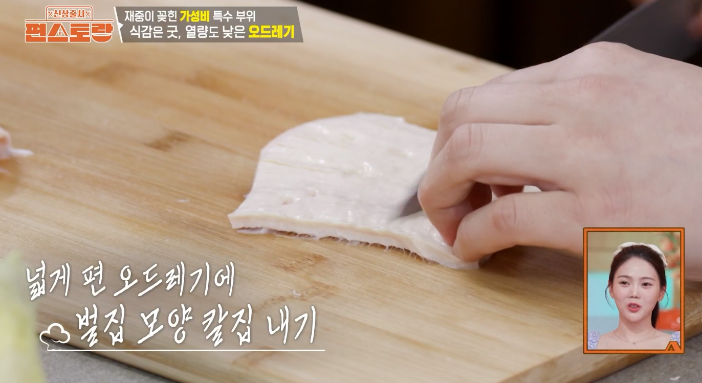 - 오드레기의 매끈한 겉 표면에 벌집 모양으로 자잘하게 칼집을 내줍니다. 이렇게 하면 양념이 잘 배고 식감이 더욱 쫄깃해집니다.