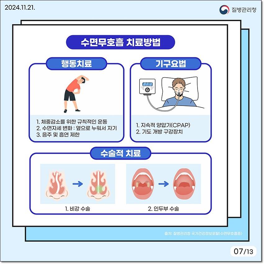 - ✔️ 주요 증상: 심한 코골이, 낮 시간 졸림, 두통, 집중력 저하, 기억력 감퇴