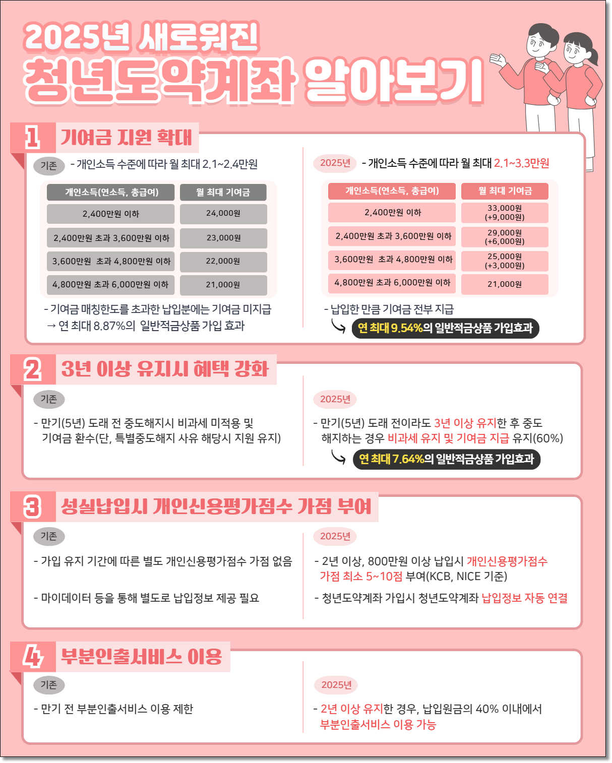 2025년 청년도약계좌는 조건 완화(가구소득, 연령)와 혜택 강화(정부기여금 확대, 중도해지 혜택, 신용점수 연계, 부분 인출 기능)까지 더해져, 한층 전략적이고 실용적인 금융상품으로 거듭났습니다.