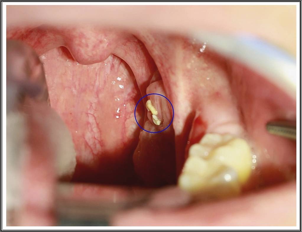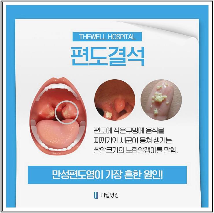 편도 표면에 작은 흰색 알갱이나 덩어리가 보이면 결석일 가능성이 큽니다. - 혀압자나 면봉 사용