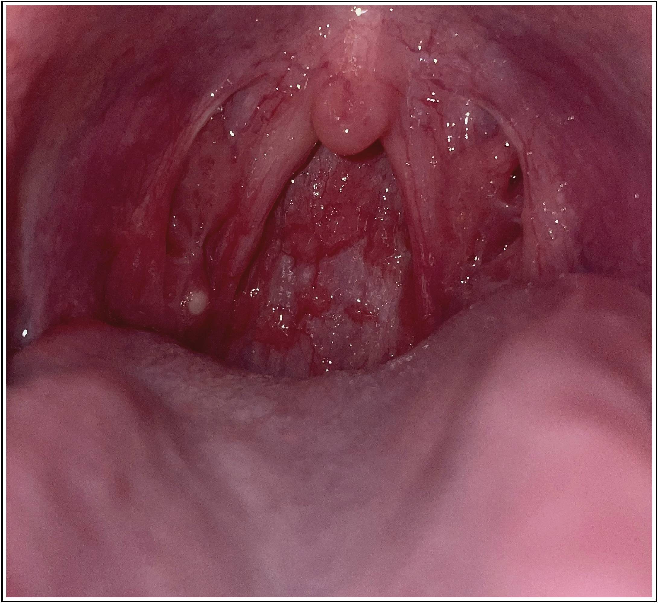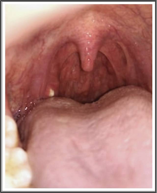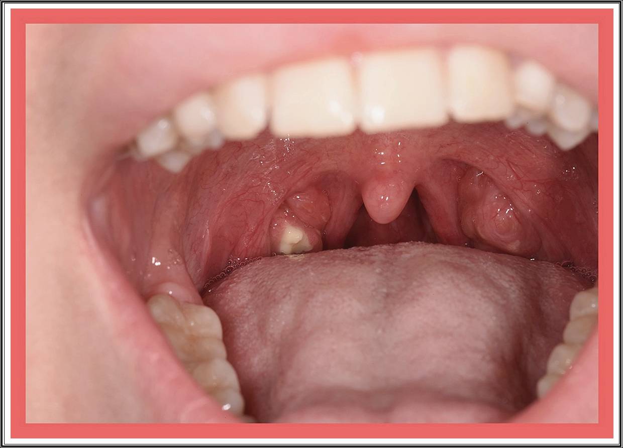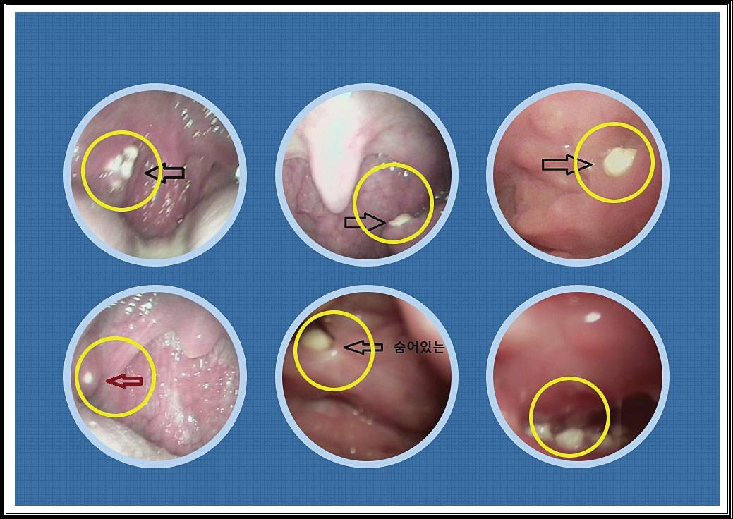 거울과 손전등으로 확인 시 작은 알갱이가 보인다. - 잦은 편도염