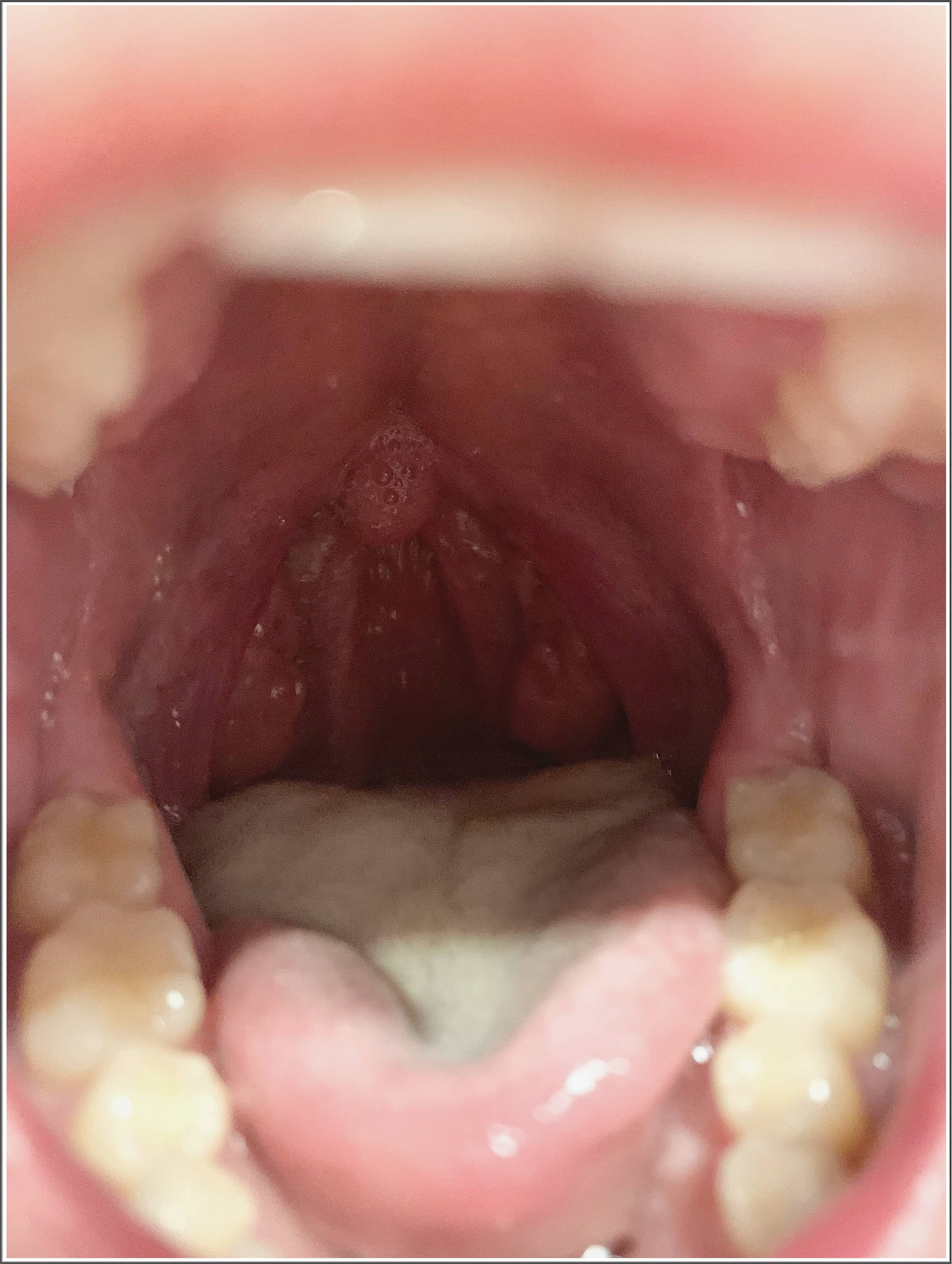 편도 부위를 살짝 눌렀을 때 흰색 조각이 나오는지 확인합니다.
