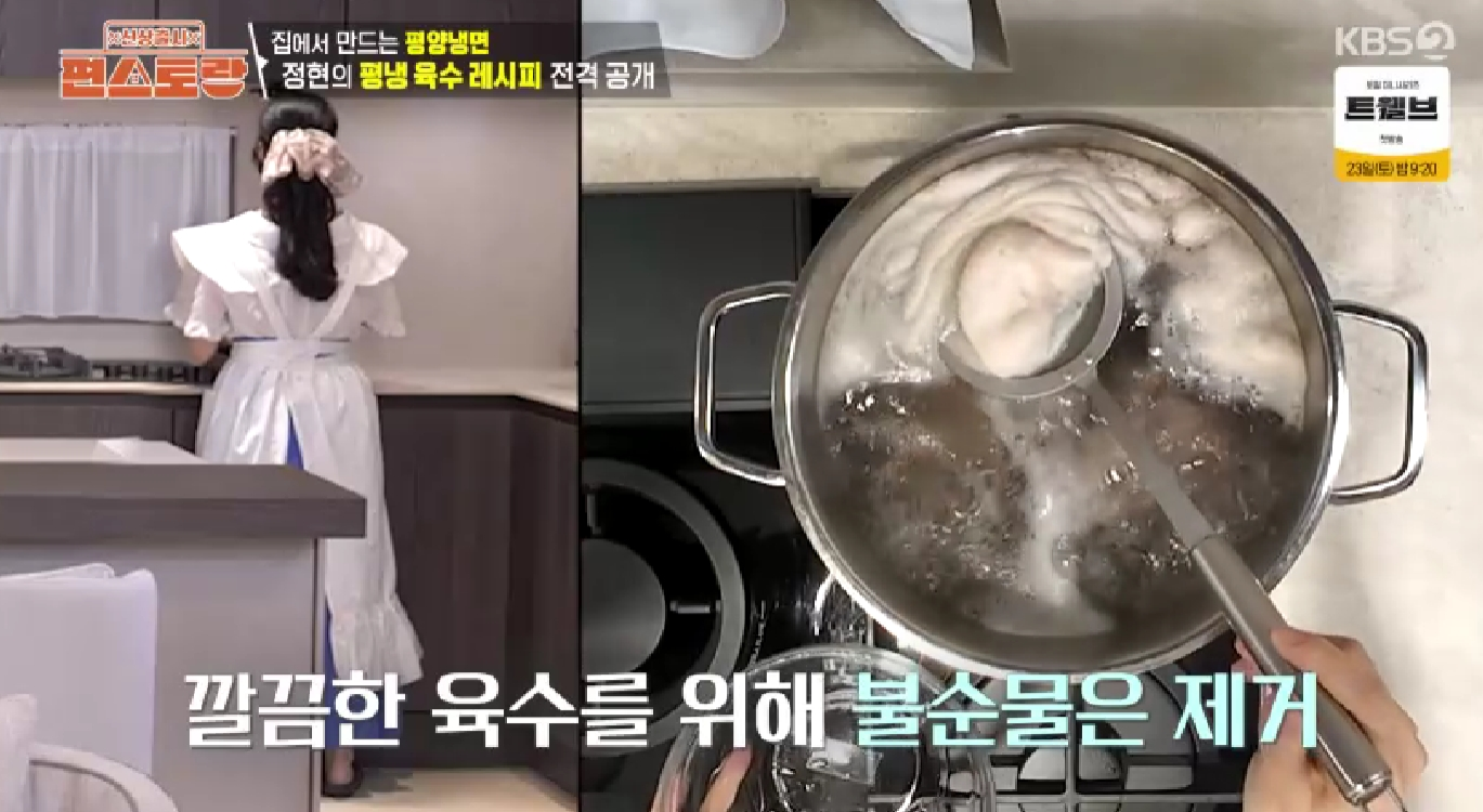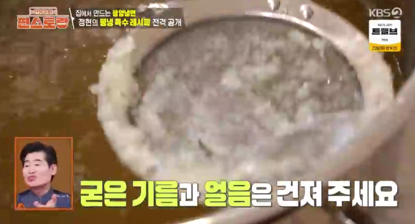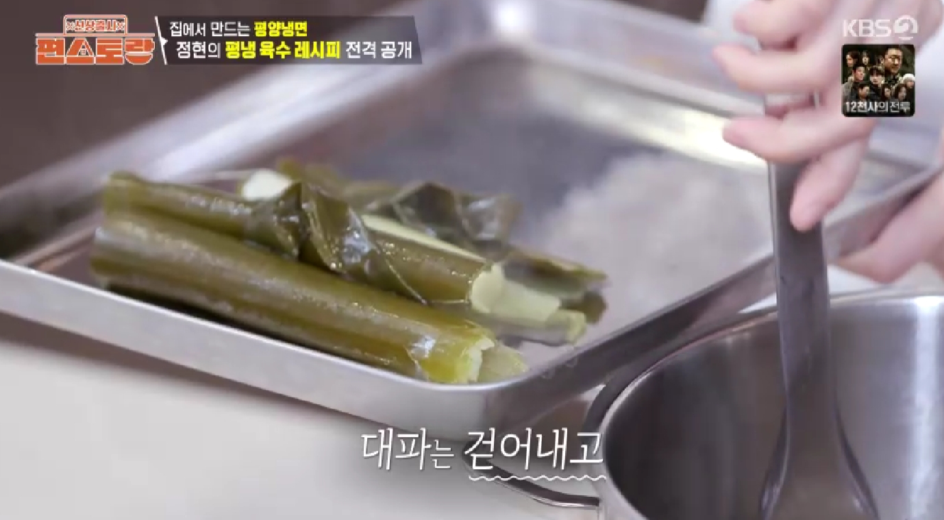 - 총 3시간을 끓인 뒤, 대파와 고기를 건져냅니다. 이 복잡한 과정이야말로 이정현 평양냉면 레시피의 핵심입니다.