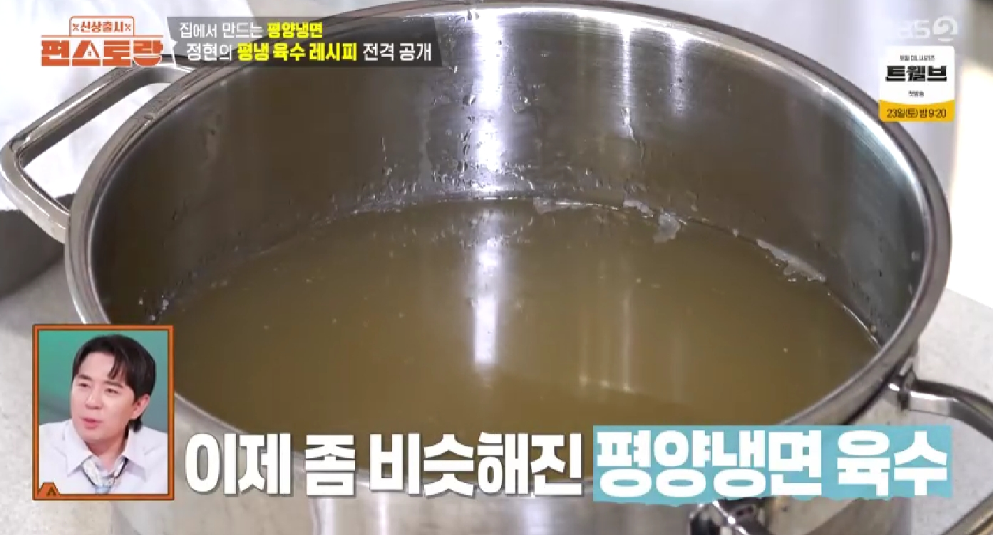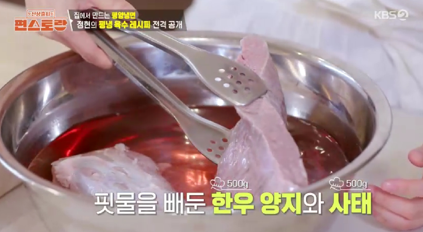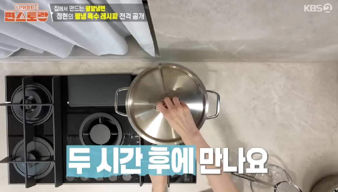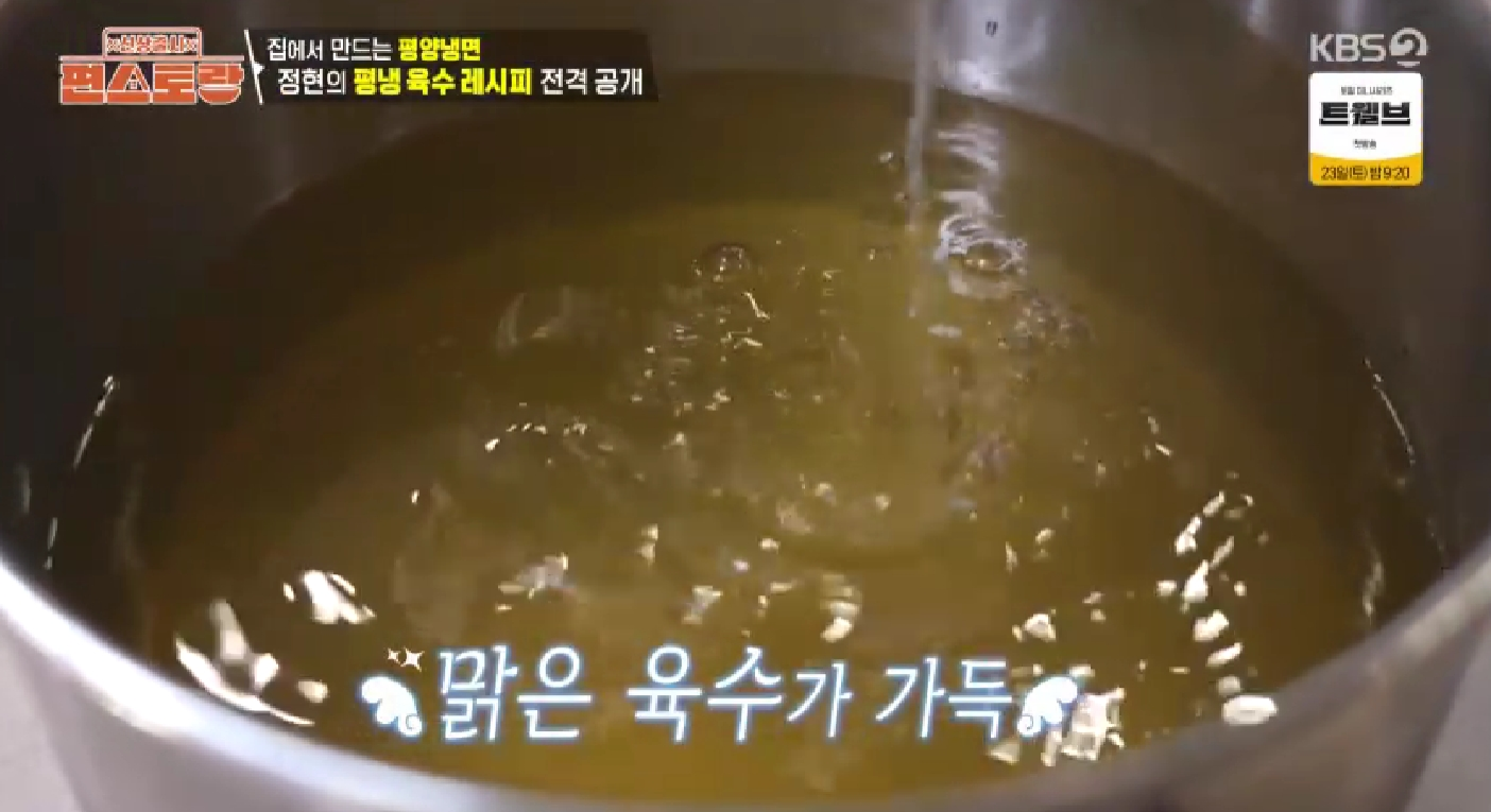 - 총 3시간을 끓인 뒤, 대파와 고기를 건져냅니다. 이 복잡한 과정이야말로 이정현 평양냉면 레시피의 핵심입니다.