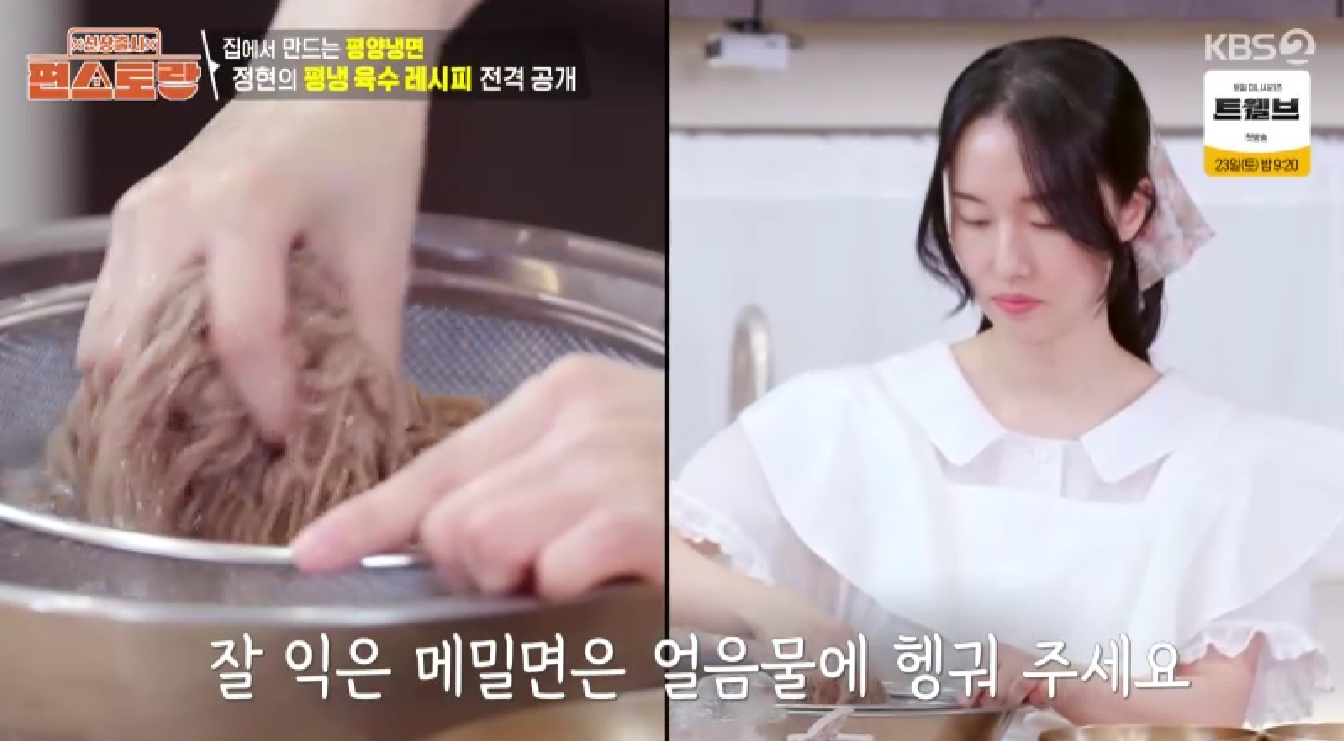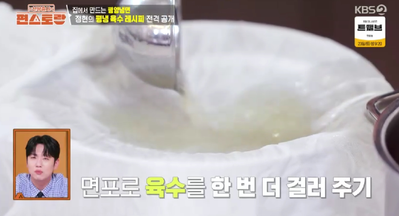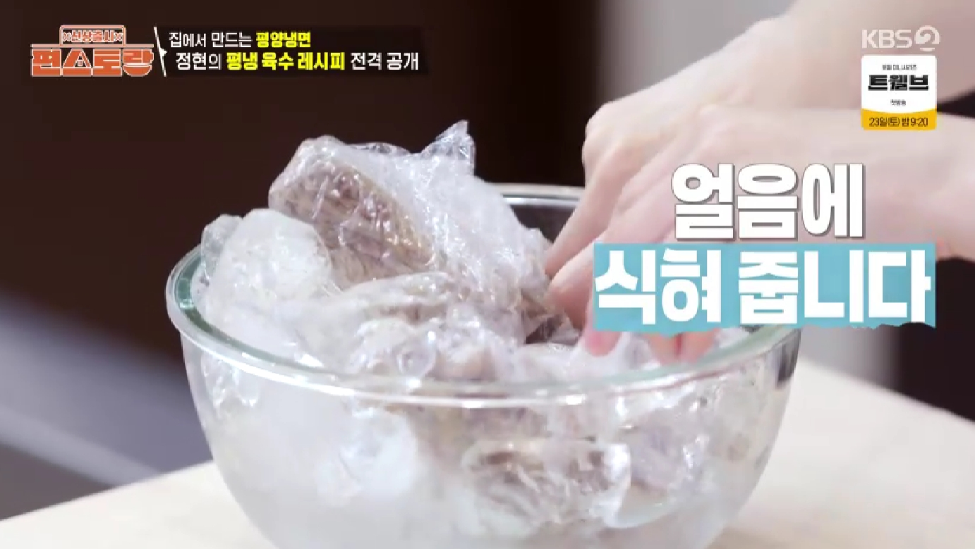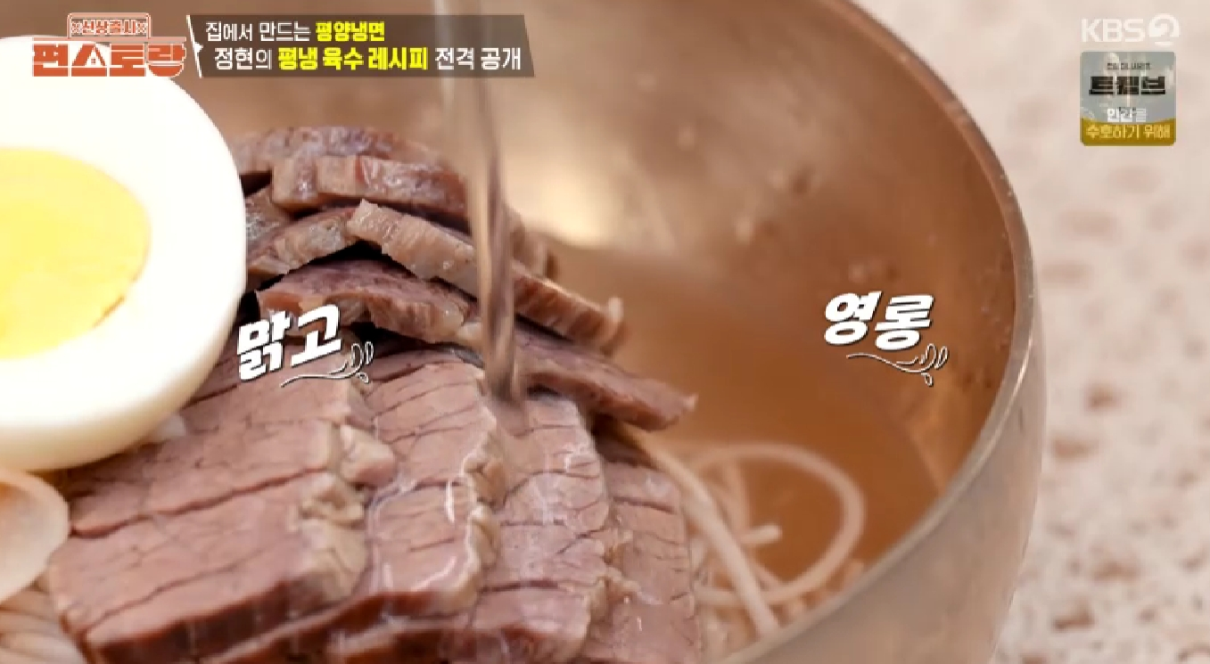 - 이렇게 완성된 맑고 깨끗한 육수는 냉장 보관 시 3~5일, 냉동 보관 시 한 달까지 보관 가능합니다. 이 이정현 평양냉면 레시피 덕분에 자취생도 평양냉면을 마음껏 즐길 수 있게 된 것입니다.