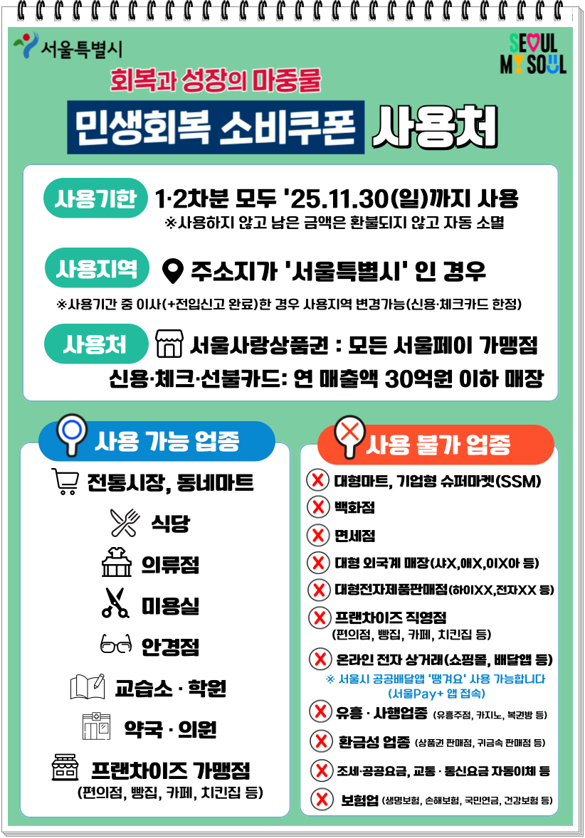 - 사용 불가: 대형마트, 백화점, SSM, 면세점, 대형 전자제품 매장, 온라인 쇼핑몰, 배달앱(비대면 결제)